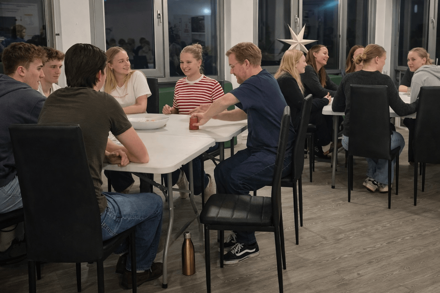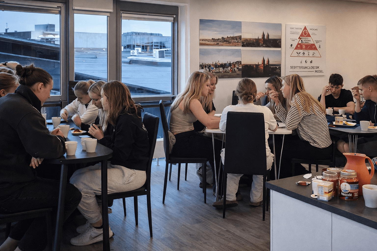 Samtidig er der, for hele college, et stort fællesrum med et veludstyret køkken der bl.a. bruges til aftensmåltider, lektiecafé og hyggeaftener. På gangene bor du med elever af begge køn og på tværs af årgange.